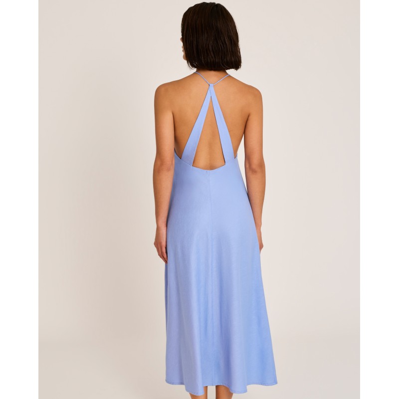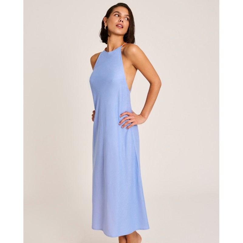 Vestido largo escote halter. Su diseño liso y elegante aporta frescura y vitalidad sin resignar sofisticación. Ideal para llevar sobre tu bikini o bañador este verano.