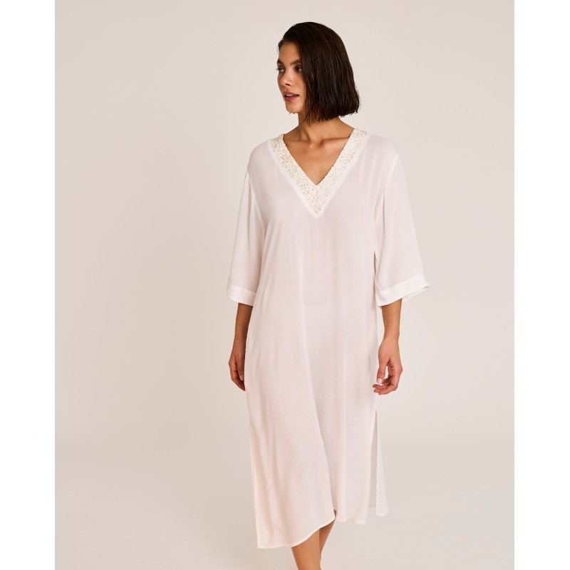 Vestido largo con mangas de escote en pico y detalles de lentejuelas. Perfecto para llevar sobre tu bikini o bañador este verano.