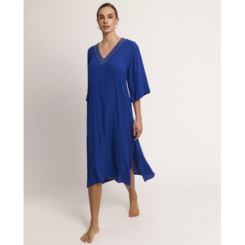 Vestido largo con mangas de escote en pico y detalles de lentejuelas. Perfecto para llevar sobre tu bikini o bañador este verano.