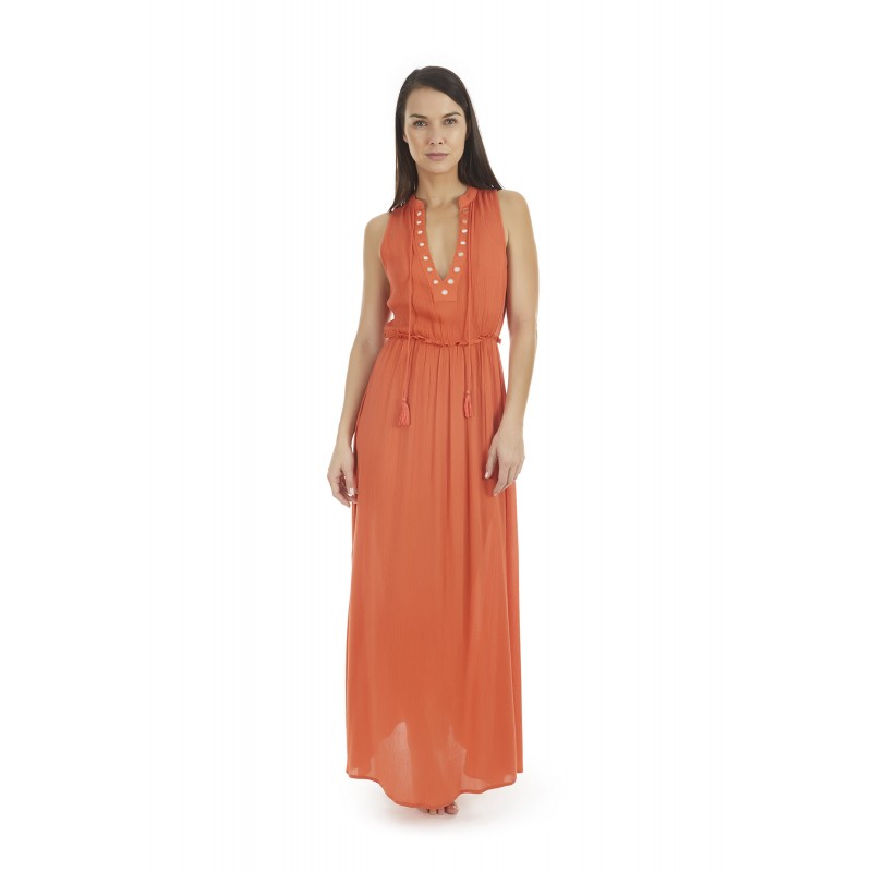 Vestido largo de tejido muy suelto. Escote en pico. Ideal para conseguir un perfecto look veraniego.