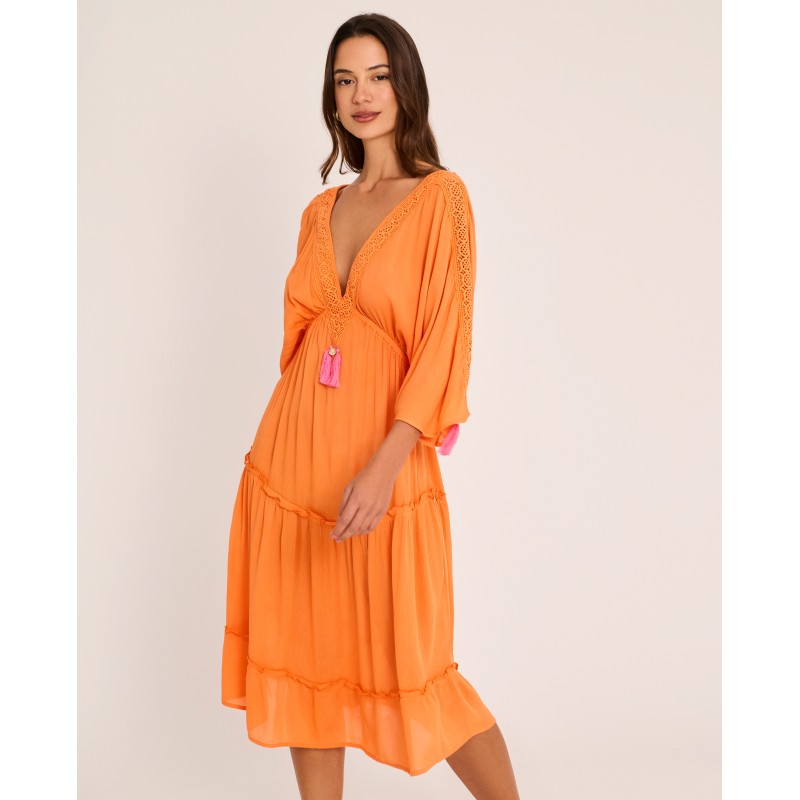 Vestido estilo bohemio de mujer con mangas. Esta pieza de tonalidad luminosa y diseño de trama delicada es ideal para llevar sobre tu bikini o bañador. Sus detalles incorporados en el frente y las mangas aportan un toque de originalidad al look.