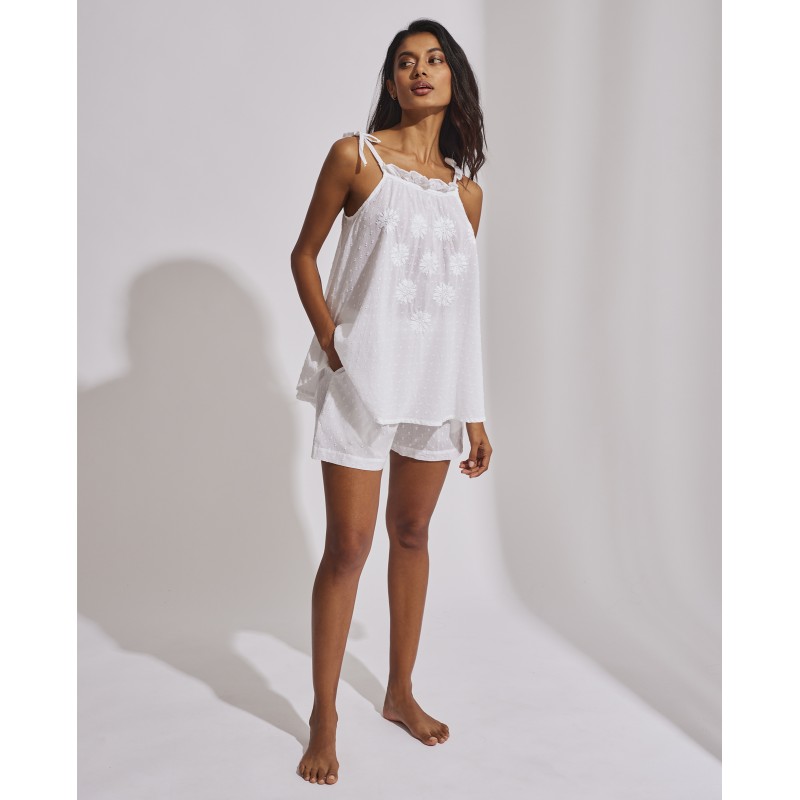 | Short two-piece pajamas. Composed of a top part with adjustable straps and shorts. Very summery and fresh design and very feminine and youthful embroidery. Ideal for this summer. |