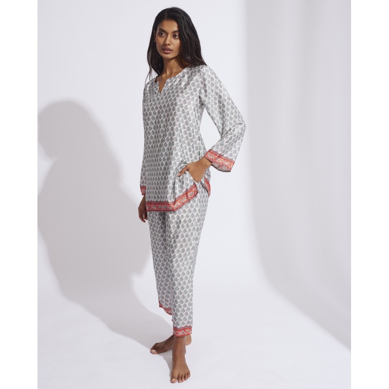 Two-piece pajamas. With a very fresh and summery print. Top with French sleeves and long pants with a pirate cut.