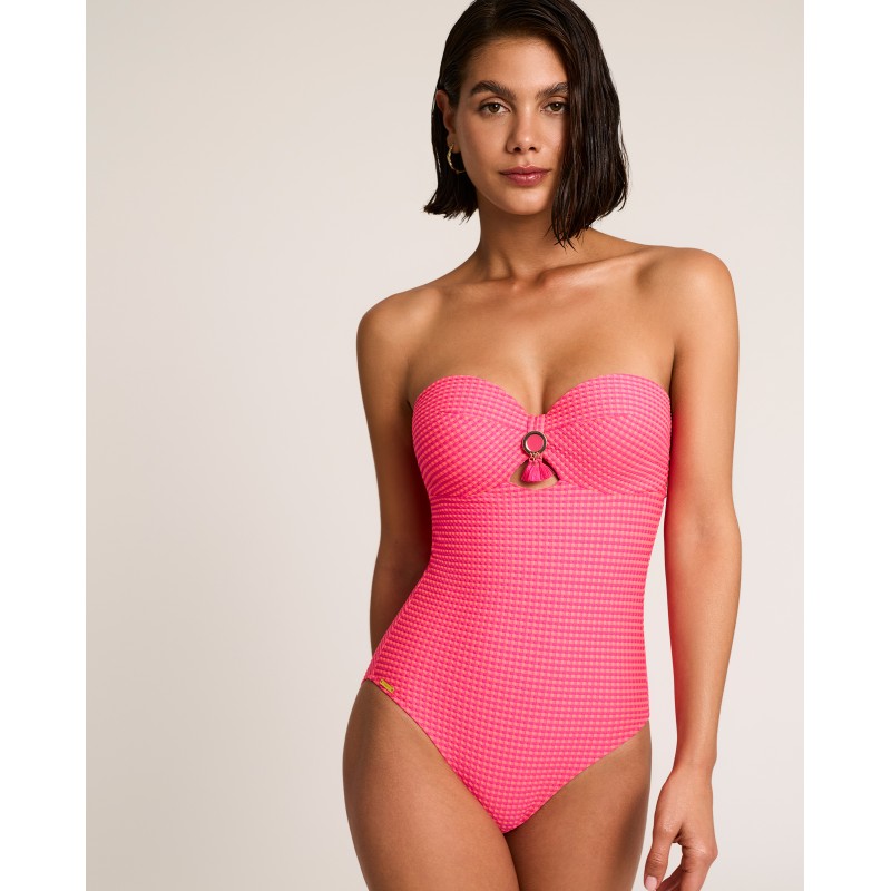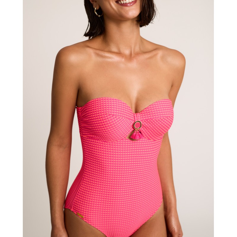 Bandeau swimsuit with removable cups and straps. This luminous piece with a delicate weave design subtly and elegantly enhances the silhouette, while its built-in accessory adds a touch of originality to the look.