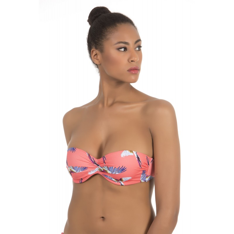 Beandeau bikini top with underwire, cups and removable straps. Bird print. Orange.