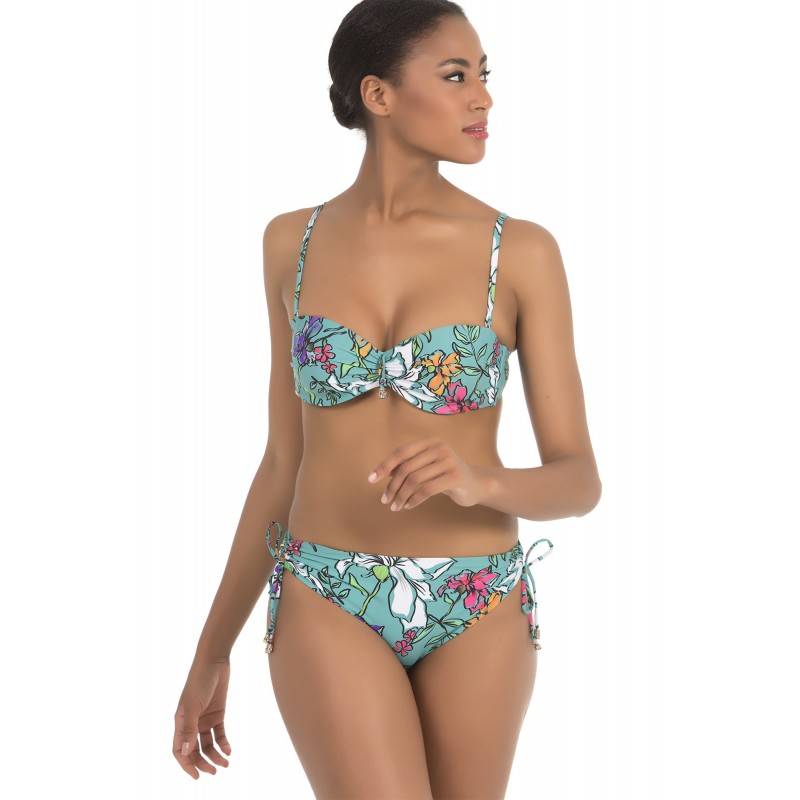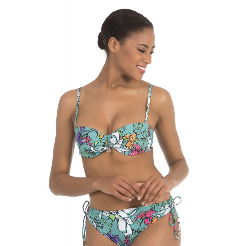 Bandeau bikini top with underwire, cups and removable straps. A very colourful flower print for this summer. Green.