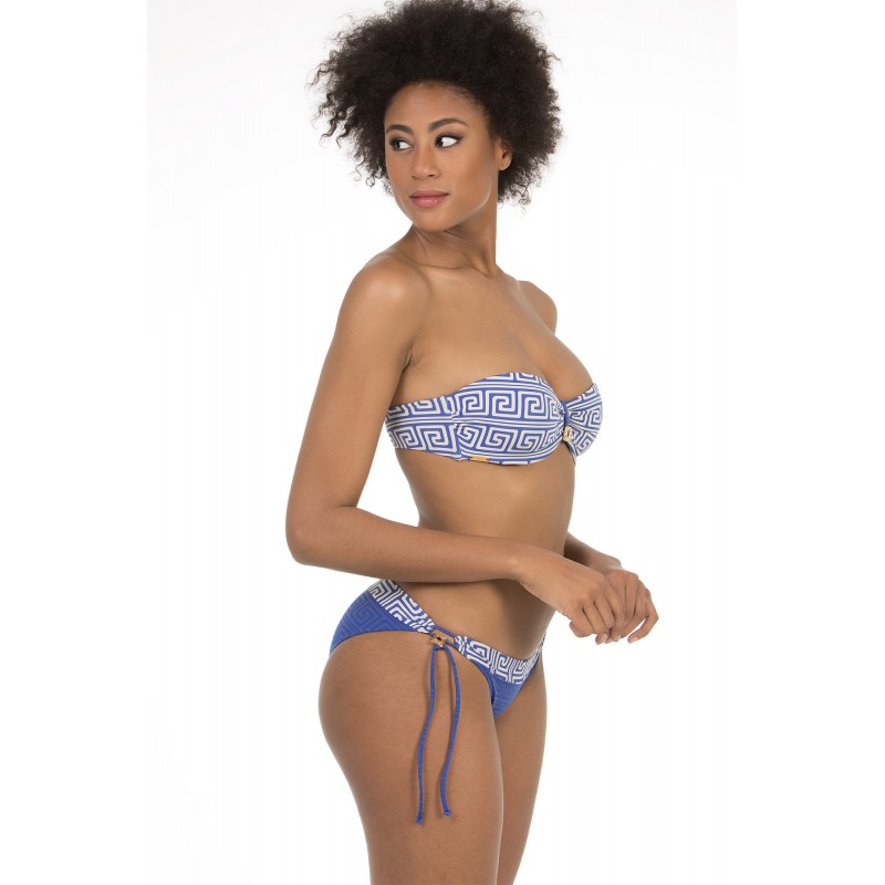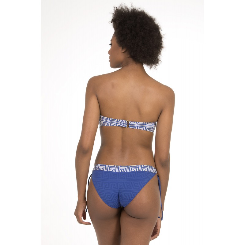 Bandeau bikini top with underwire and cups. Removable straps. Labyrinth print. Blue.