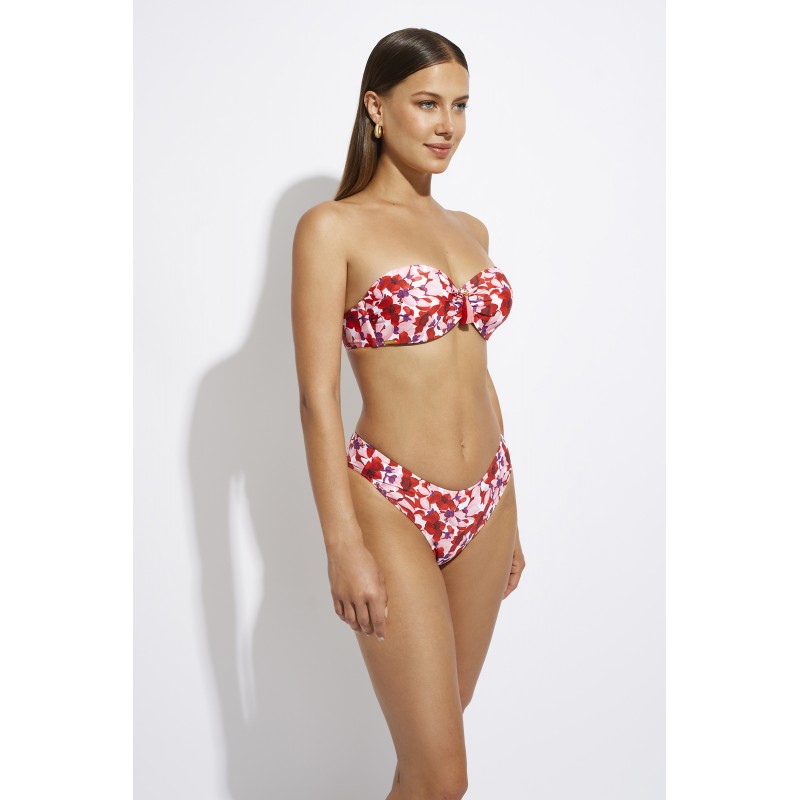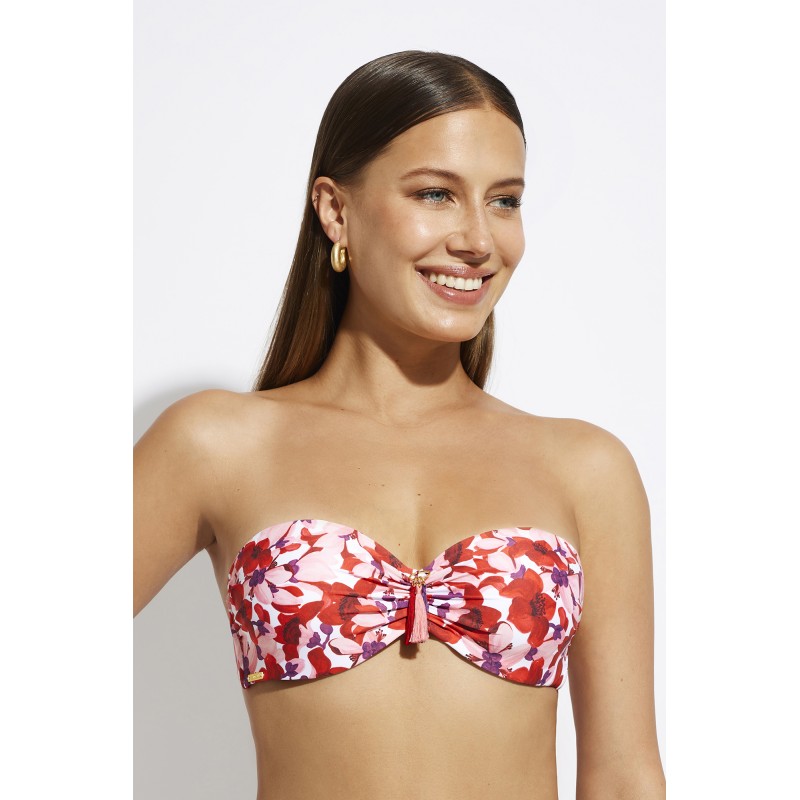 Bandeau bikini top with underwire and cup. With removable straps. Its floral print makes it a cheerful and youthful piece.