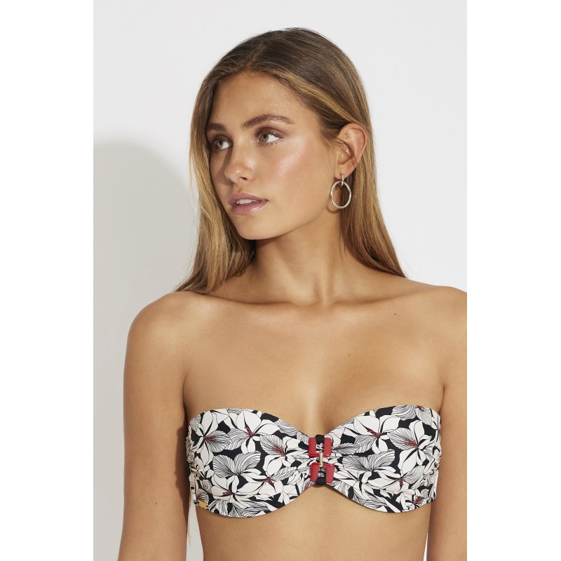 Bandeau bikini top with underwire and cup. With an exquisite floral print, very feminine and sensual to show off on the beach or pool.