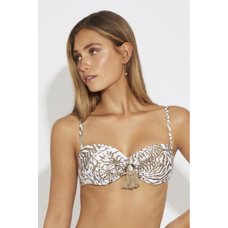Bandeau bikini top with underwire and cup. Made of recycled fabric. Its striking ethnic shell design inspired by dream beaches will captivate you.