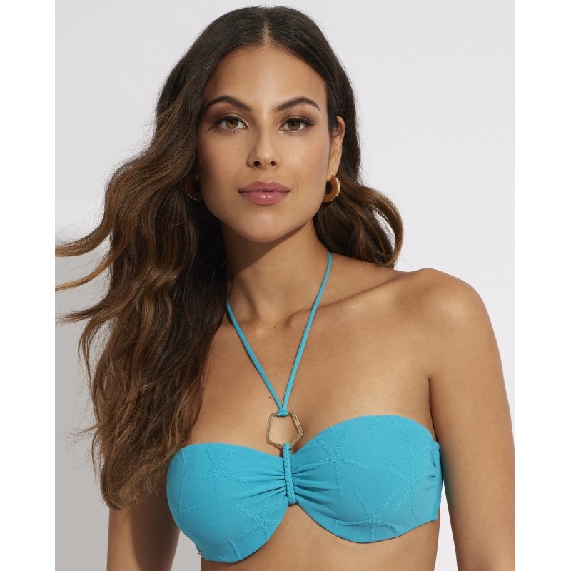 Bandeau bikini top with underwire and cup. Solid color and feminine details, this design maintains the elegance and subtlety of the plain print.