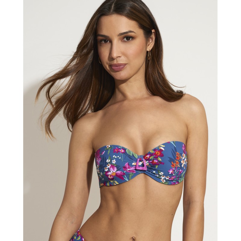 Bandeau bikini top with underwire and cup. This floral and colorful design is perfect for looking radiant and vibrant at the beach or pool this summer.