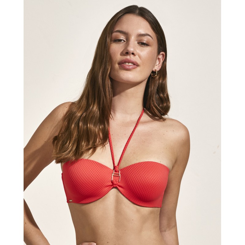 Bandeau bikini top with underwire and cups. With removable straps. This versatile design is perfect for those who want a garment that adapts to various occasions and styles. Its comfortable and secure fit allows you to enjoy water activities without worries, whether at the beach or in the pool. Without a doubt, it is a classic, practical and elegant option for summer, ideal for looking good while having fun in the sun.