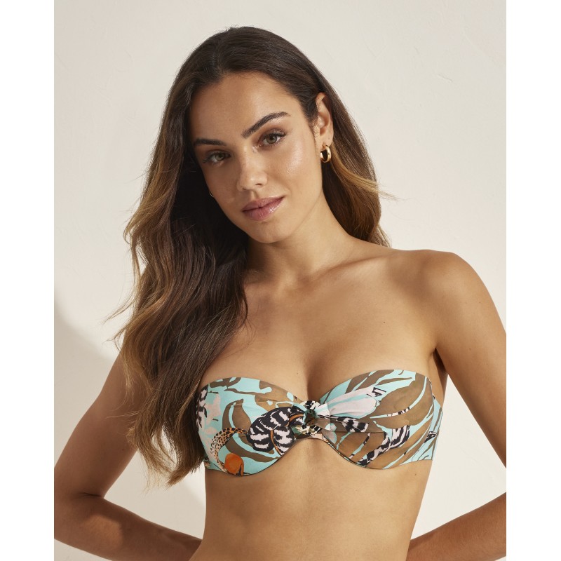Bandeau bikini top with underwire and cups. With removable straps. Its design captures the energy of nature, with prints that transport you to vivid and mysterious landscapes of the Amazon rainforest.