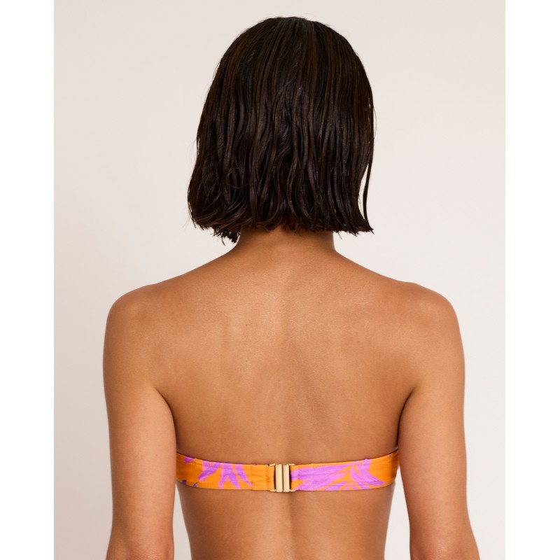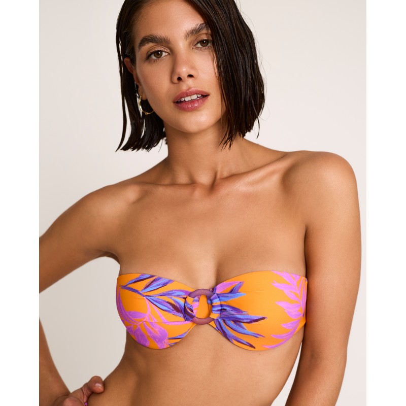 Bandeau bikini top with underwire and cups. Features removable straps. A tropical-inspired print in vibrant, summery colors. Perfect for enjoying the sun this season. Made from recycled materials.