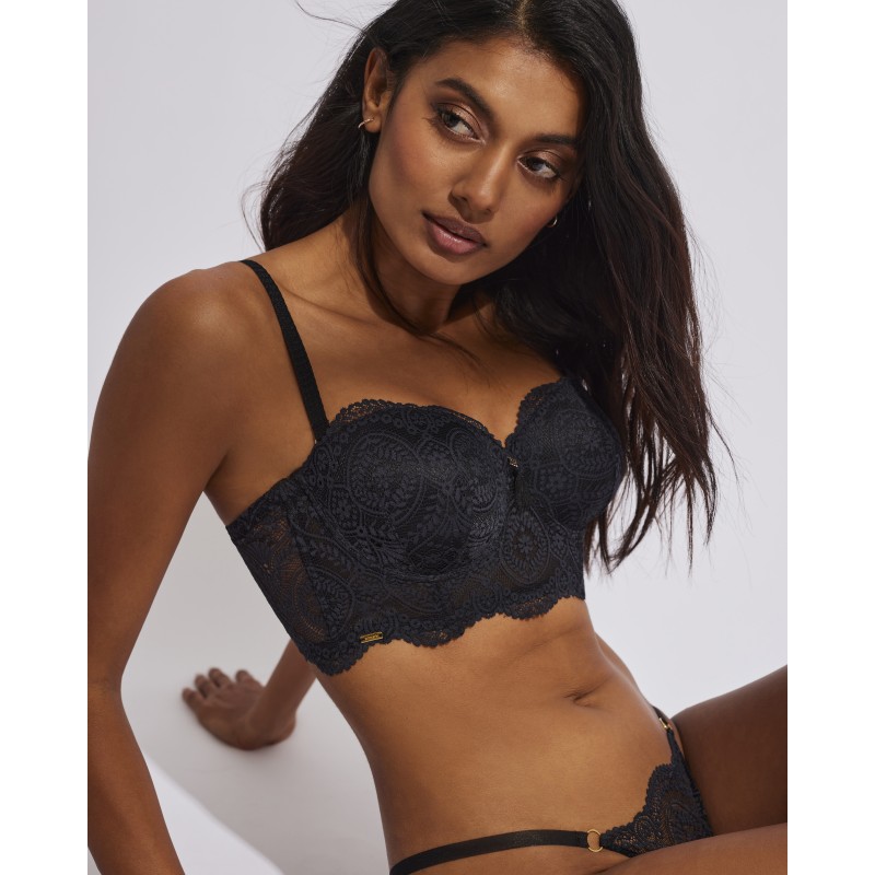 Balconette style bandeau bra. With ring and inner cup with foam. Wide shoulder and non-slip silicone trim. Its spectacular lace design gives it a romantic and bohemian style at the same time. This garment combines sensuality, freshness and elegance, ideal for free and authentic women.
