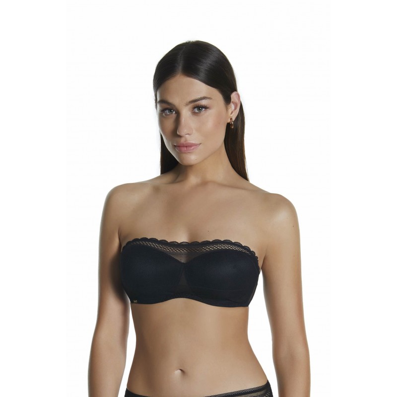 Bandeau bra with cup. Ideal to show off cleavage avoiding the unwanted sliding effect. Inspired by the crafts and rustic style of the season, its lace is pure art.