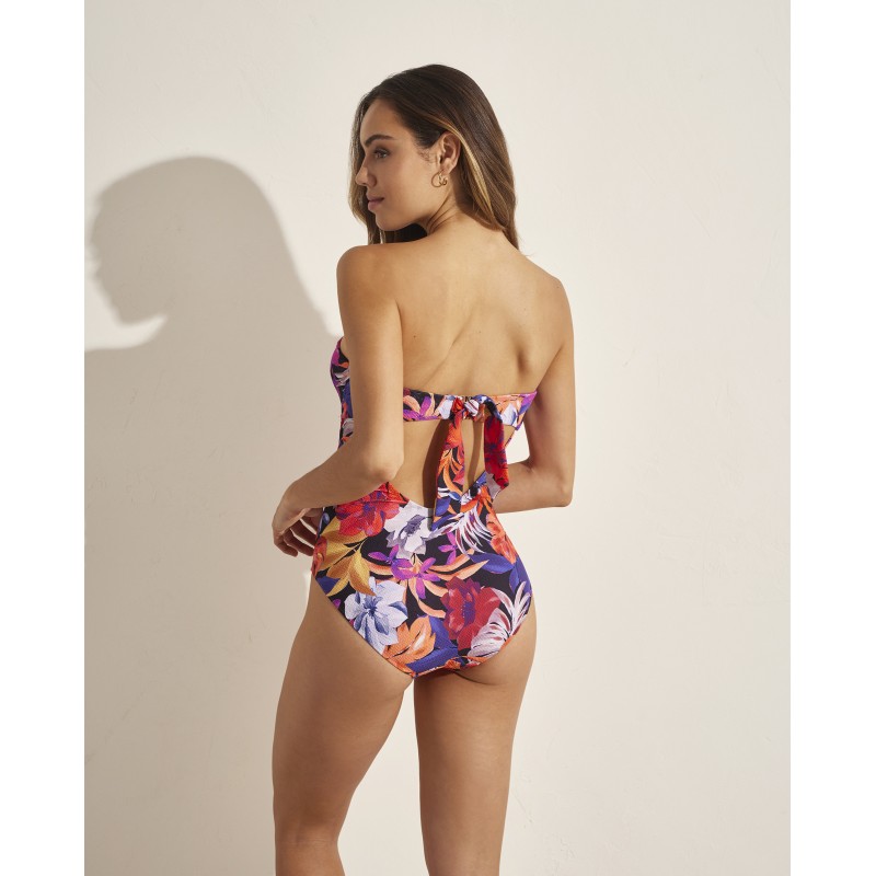 Bandeau swimsuit with removable cups and straps included. With a very tropical print full of bright colors that evoke the holiday spirit.