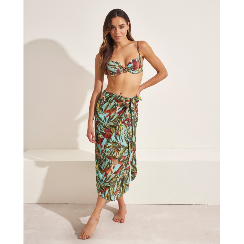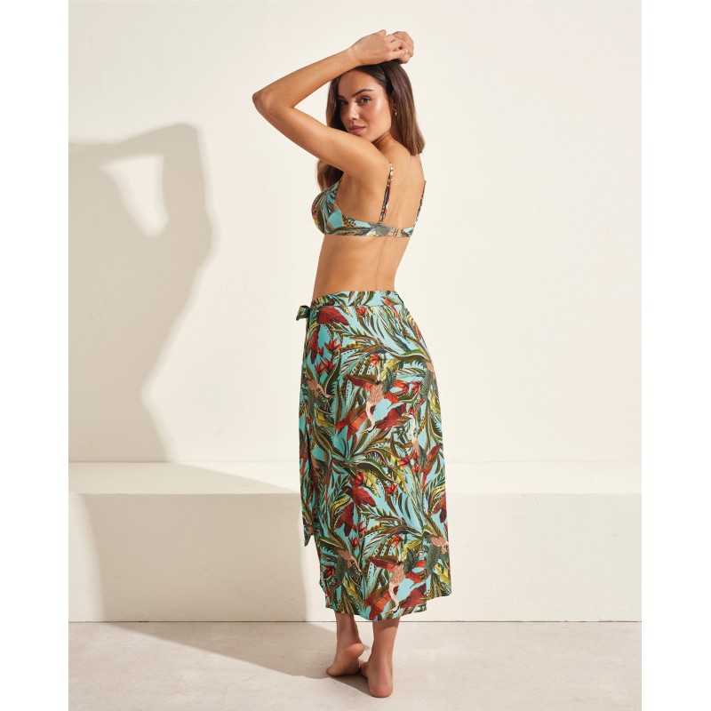 Beach wrap made of soft and wide fabric. This spectacular design with vibrant tones inspired by wild flora and fauna reflects the exuberance and vitality of tropical wild nature. Ideal to wear to match your bikini or swimsuit.