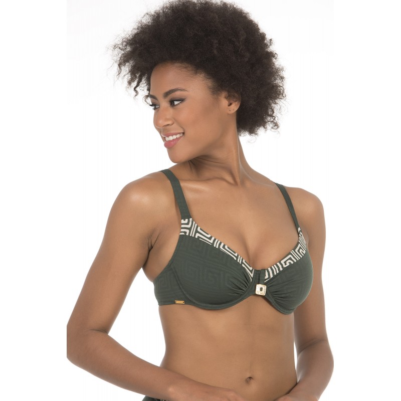 Unpadded big size bikini top. With underwire and wide straps for a perfect fit. Khaki green.