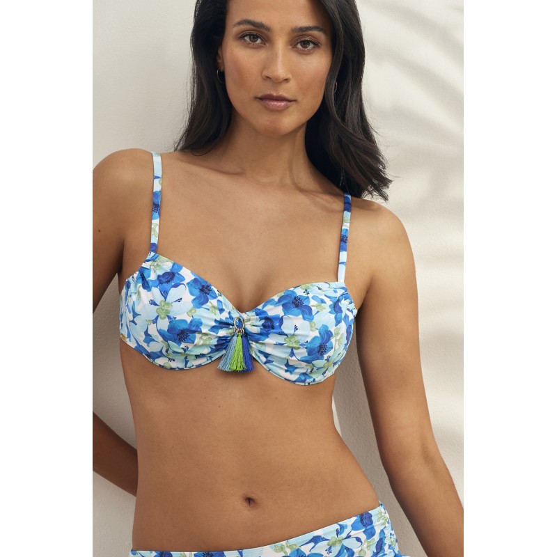 Big size bikini top without foam. With underwire and adjustable straps to guarantee a perfect fit. Its floral print makes it a cheerful and youthful piece.