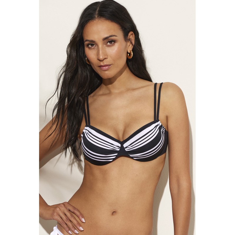 Bikini top without foam. With underwire and adjustable straps to guarantee a perfect fit. Its black and white design gives it a retro, elegant and seductive style.