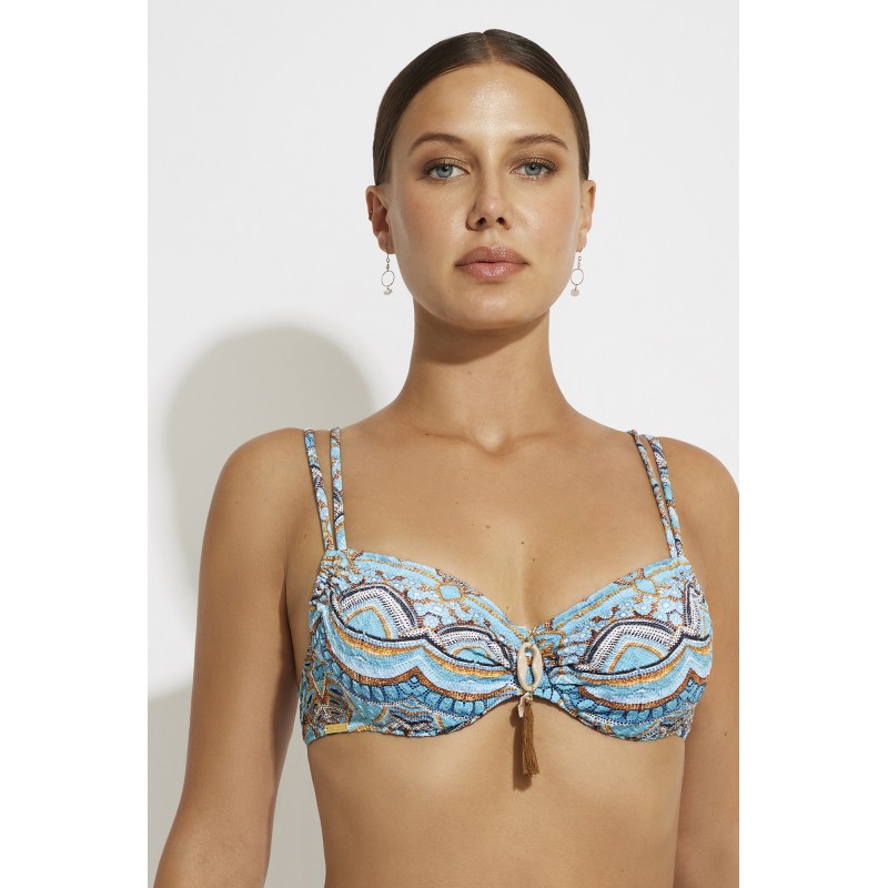 Bikini top without foam. With underwire and adjustable straps to guarantee a perfect fit. With its ethnic design in bright colors, this piece will make you shine this summer.