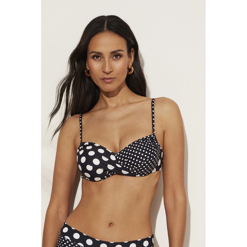 Bikini top without foam. With underwire and adjustable straps to guarantee a perfect fit. With a distinctive design that combines two polka dot prints that makes it a very colorful bathroom piece, ideal for this summer.