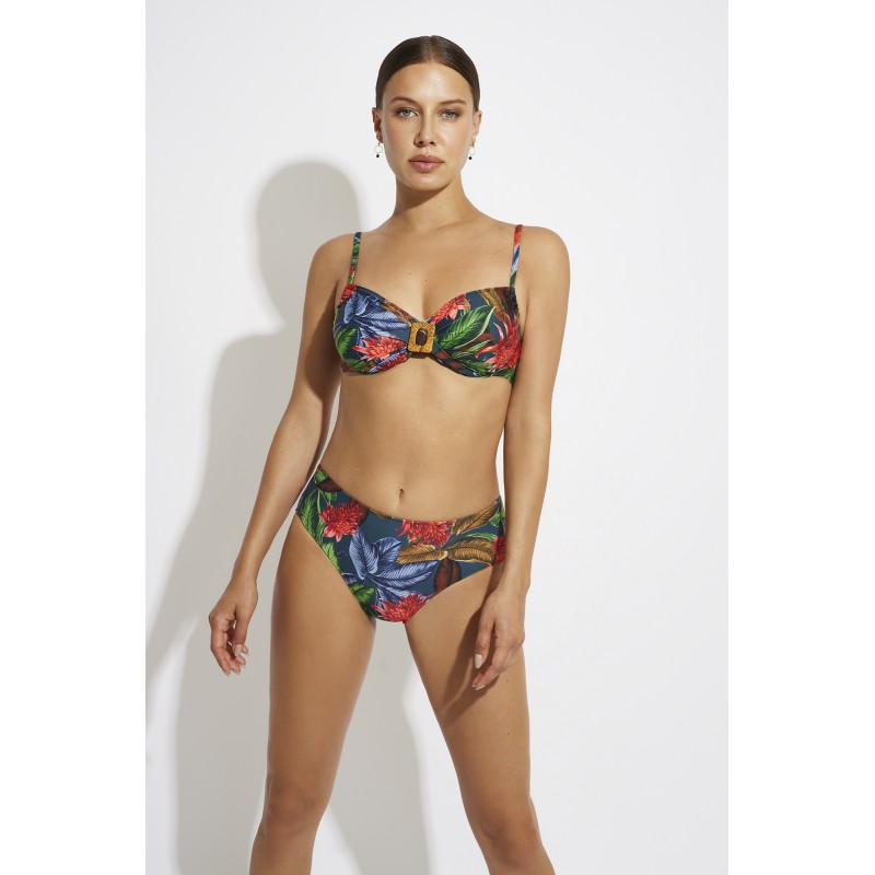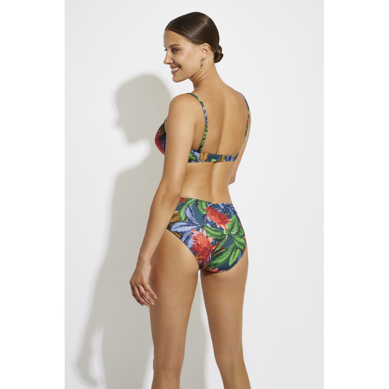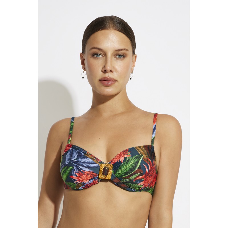 Bikini top without foam. With underwire and adjustable straps to guarantee a perfect fit. A very summery design with a tropical print. A piece loaded with color and freshness.