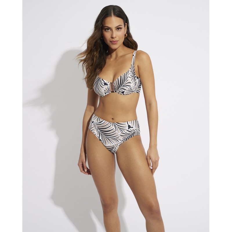 Capacity bikini top without foam. With underwire and adjustable straps to guarantee perfect support. This print is the ideal choice for those looking for a tropical and fresh look. Palm leaves represent the exoticism and beauty of the tropics, conveying a feeling of escapism and freedom.