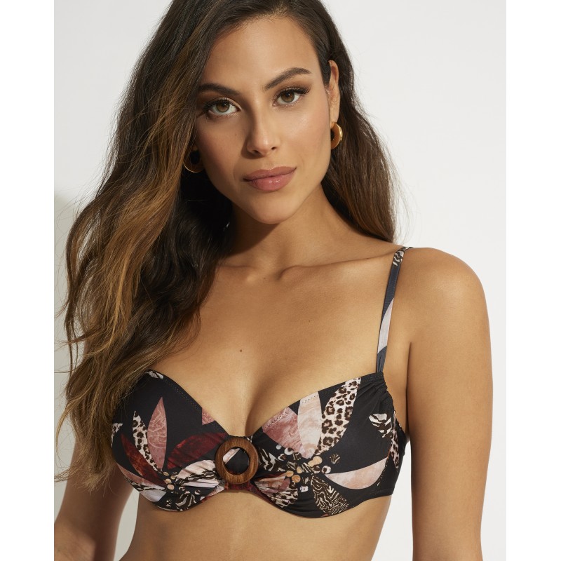 Capacity bikini top, no padding. With underwire and coordinated double straps for perfect support. Its jungle print conveys a feeling of freshness, joy and exoticism. It is a perfect piece to show off a wild and tropical style on the beach or pool.