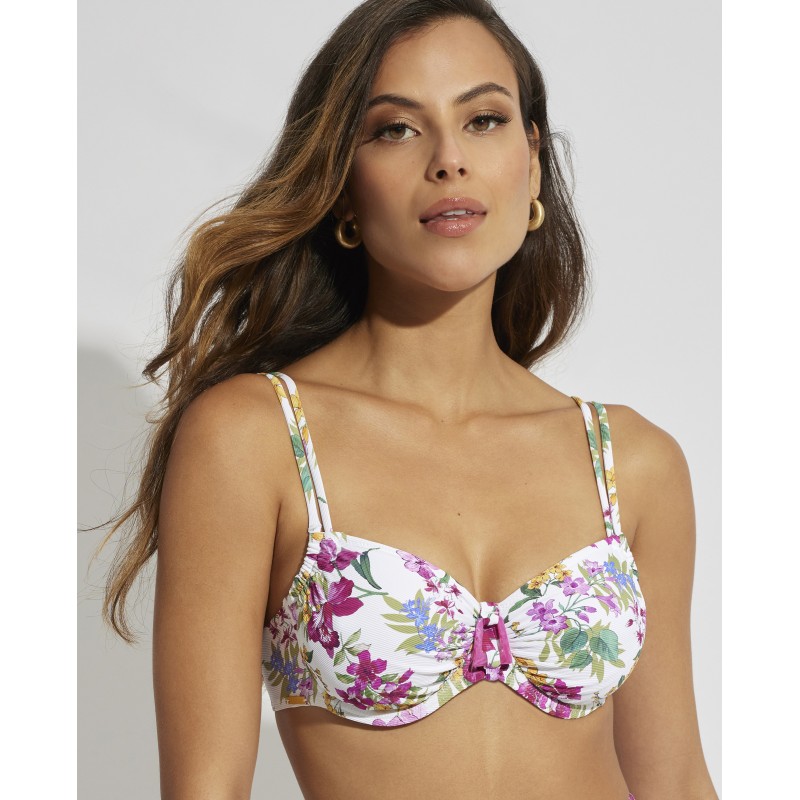 Capacity bikini top without foam. With underwire and adjustable straps to guarantee perfect support. This floral and colorful design is perfect for looking radiant and vibrant at the beach or pool this summer.