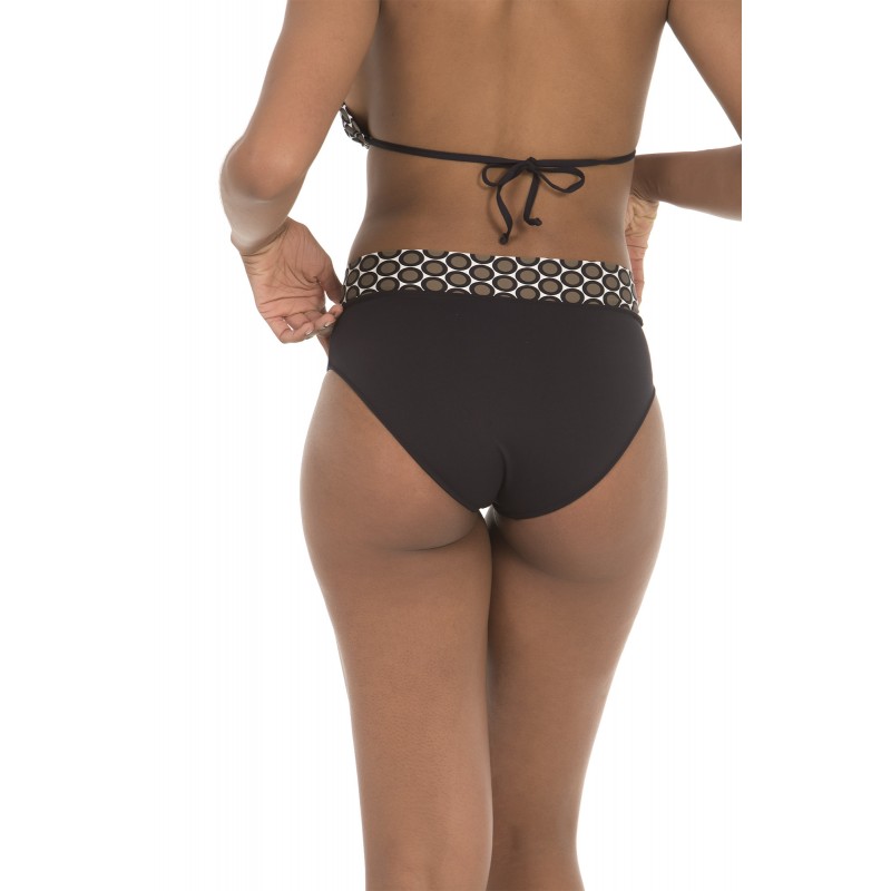 Classic bikini bottom. With a printed upper band that can be stretched to become a high-waist panty. Dot print. Brown.