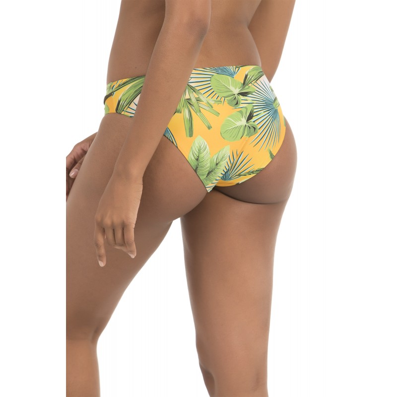 Bikini bottom with palm tree print. Classic and timeless style. Yellow.
