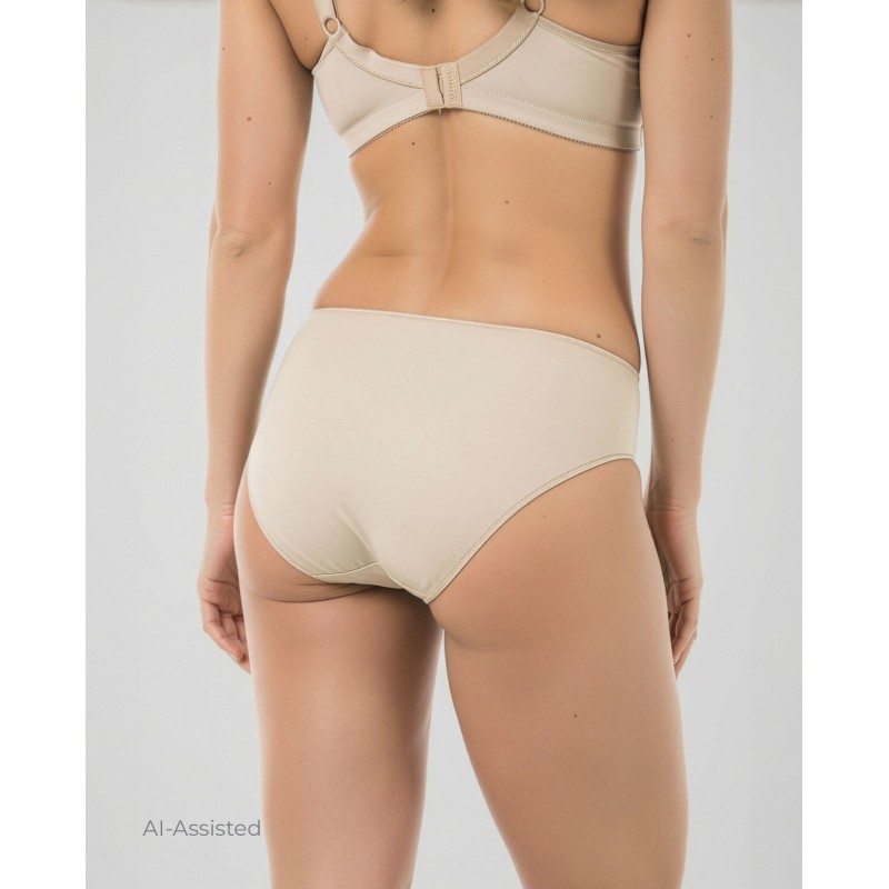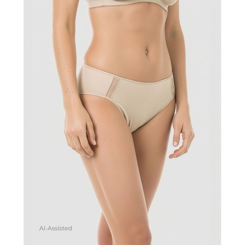 Unpatterned bikini panty. With transparencies and a comfortable and light design. Does not mark seams and guarantees maximum support. Nude.
