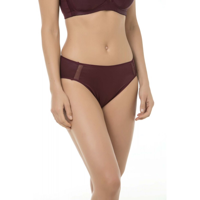 Unpatterned bikini panty. With transparencies and a comfortable and light design. Does not mark seams and guarantees maximum support. Aubergine colour.