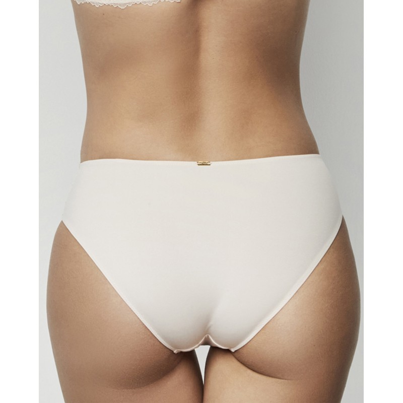 Classic cut bikini bottom combined with floral lace on the sides, which gives the garment softness and exquisite detail. The elastic waistband does not show through. This is a delicate and sophisticated garment. The Agatha collection, to which it belongs, embodies the maturity and splendor of the brand, offering pieces that not only adorn, but transform. A collection with charm and charisma.