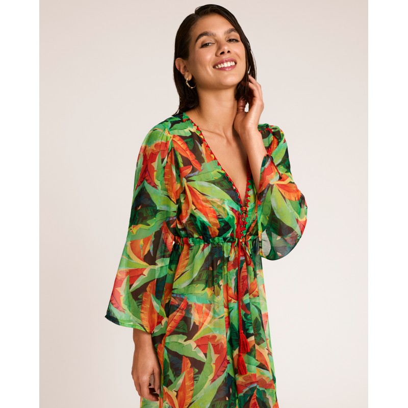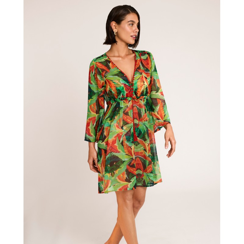 Short, blouson-style dress with long sleeves and an embroidered neckline. Inspired by lush nature, this tropical print is perfect for sunbathing and moments by the water. Ideal for completing your outfit.