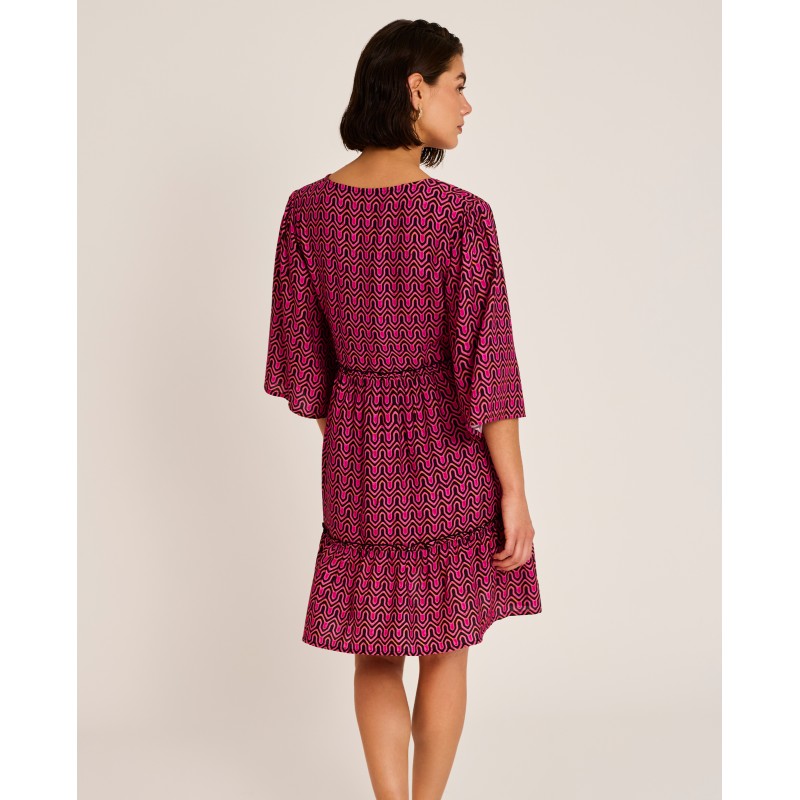 Short dress with blouson-style sleeves and a V-neck. Featuring a geometric print that adds dynamism and a summery feel. A contemporary and sophisticated option for this season. Made with recycled materials.