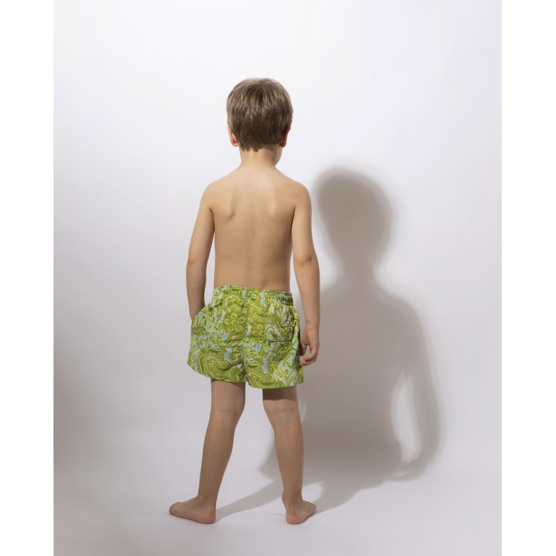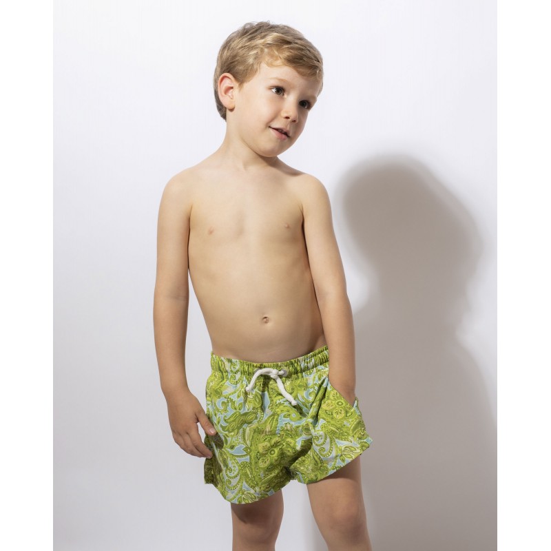 Classic cut boy's swimsuit. Its ethnic design and vibrant colors give a touch of originality and unique style to this piece. Ideal to match with the whole family this summer.