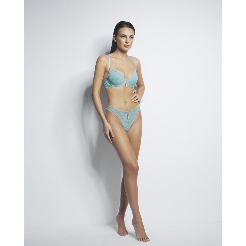 Brazilian panty with delicate lace details. This garment is a promise of special moments, a touch of mystery and seduction that transforms the power of femininity in its most refined and captivating form.