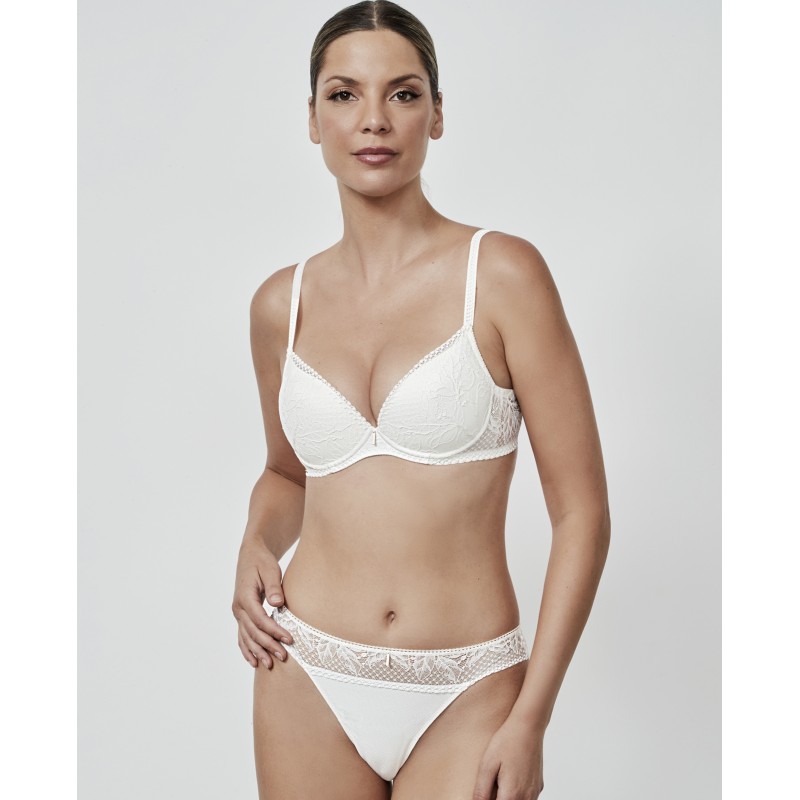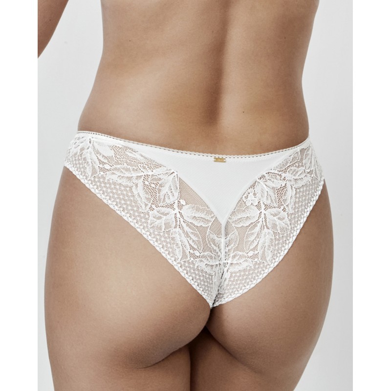 Brazilian-cut panty with floral lace that continues from front to back, adding softness and exquisite detail to the garment. The elastic waistband provides a non-marking effect. The Malitzia collection, to which it belongs, represents a perfect dance between delicate and daring.