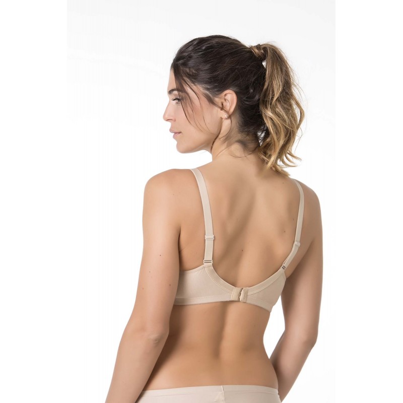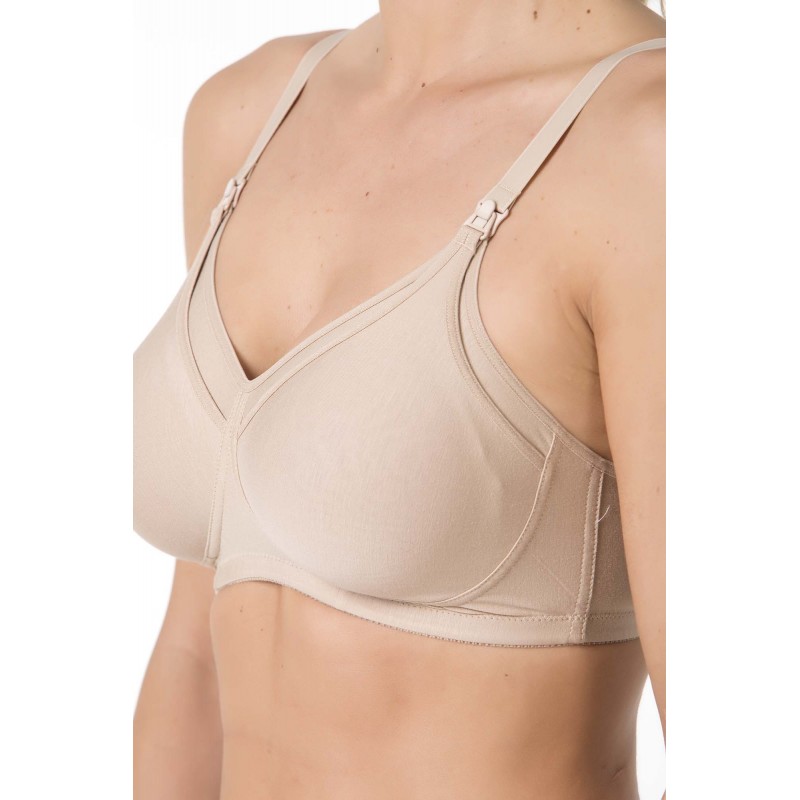 Nude moded fabric breastfeeding bra, specially developed for breatfeeding. Breathable cotton preformed double fabric comfort bra, wireless. Front opening with clip on the strap to make easier breastfreeding.