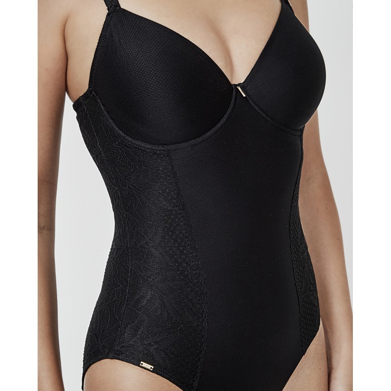 Slimming bodysuit with floral lace details on the sides. Featuring a preformed tulle control cup and a lined interior for maximum support. Features an underwire and base. No foam cups. Two strap sizes available. Slims the figure without sacrificing comfort and style. The Malitzia collection, to which it belongs, represents a perfect dance between delicate and daring.