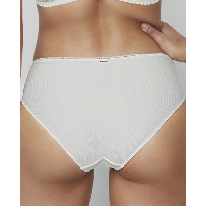 Classic bikini bottoms with a lace detail at the front, adding softness and exquisite detail to the garment. The elastic waistband provides a non-marking effect. The Malitzia collection, to which it belongs, represents a perfect dance between delicate and daring.