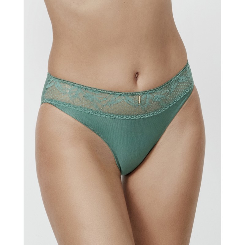 Classic bikini bottoms with a lace detail at the front, adding softness and exquisite detail to the garment. The elastic waistband provides a non-marking effect. The Malitzia collection, to which it belongs, represents a perfect dance between delicate and daring.