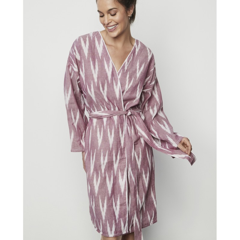 Short dressing gown with a bow at the waist and long sleeves. 100% cotton. Its ethnic-style print makes it an original garment that evokes freshness and a very youthful style.