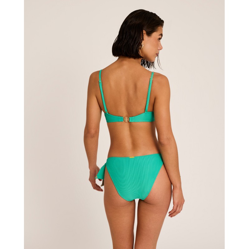 Deep V-neck bikini top with foam padding and no underwire. Features multi-position straps. Perfect for those seeking comfort. Its uniform color and timeless style make it ideal for showing off this season.