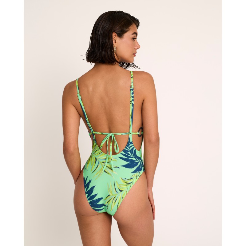 Multi-position triangle bikini with a low-cut neckline, removable cups, and no underwire. Featuring a tropical-inspired print and vibrant colors that evoke summer. Perfect for enjoying the sun this season. Made with recycled materials.