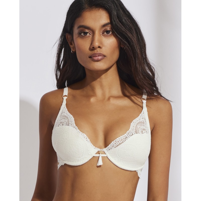 Deep neckline bra. Shapes and enhances. Its spectacular lace design gives it a romantic and bohemian style at the same time. This garment combines sensuality, freshness and elegance, ideal for free and authentic women.